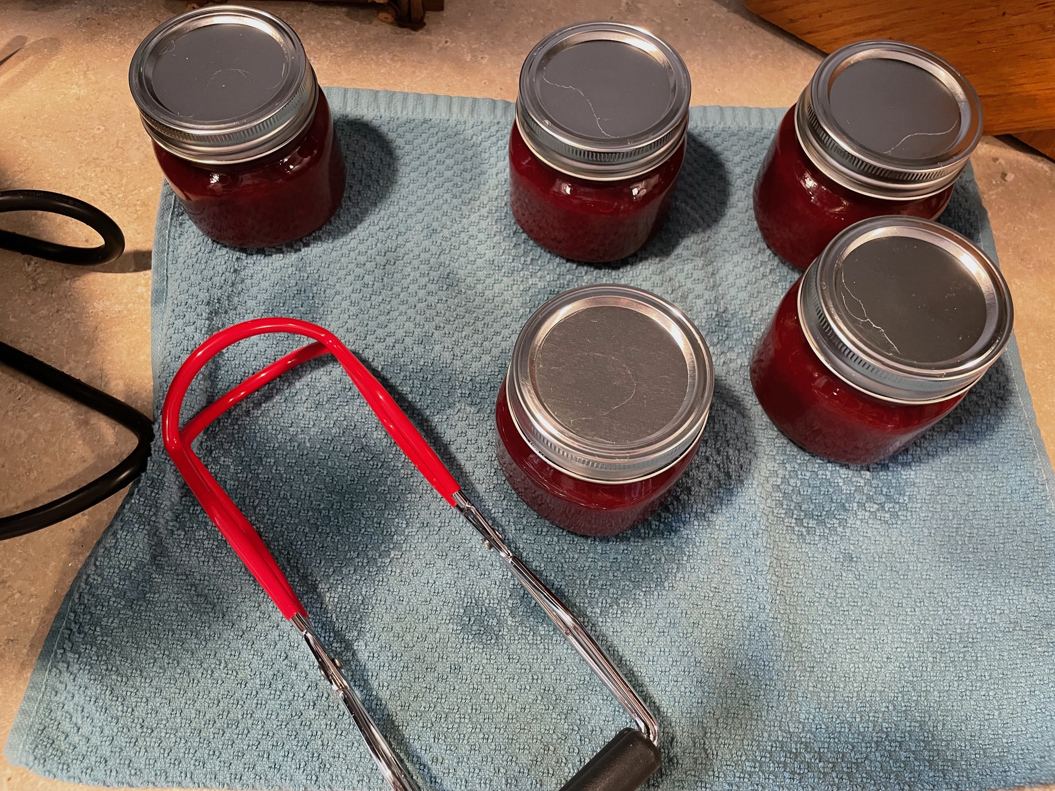 I reversed my grip, and hoisted the four remaining jars straight up and out of the canner and onto the remaining pristine towel. I fished out the other jar. It would probably have to go into the frig.
