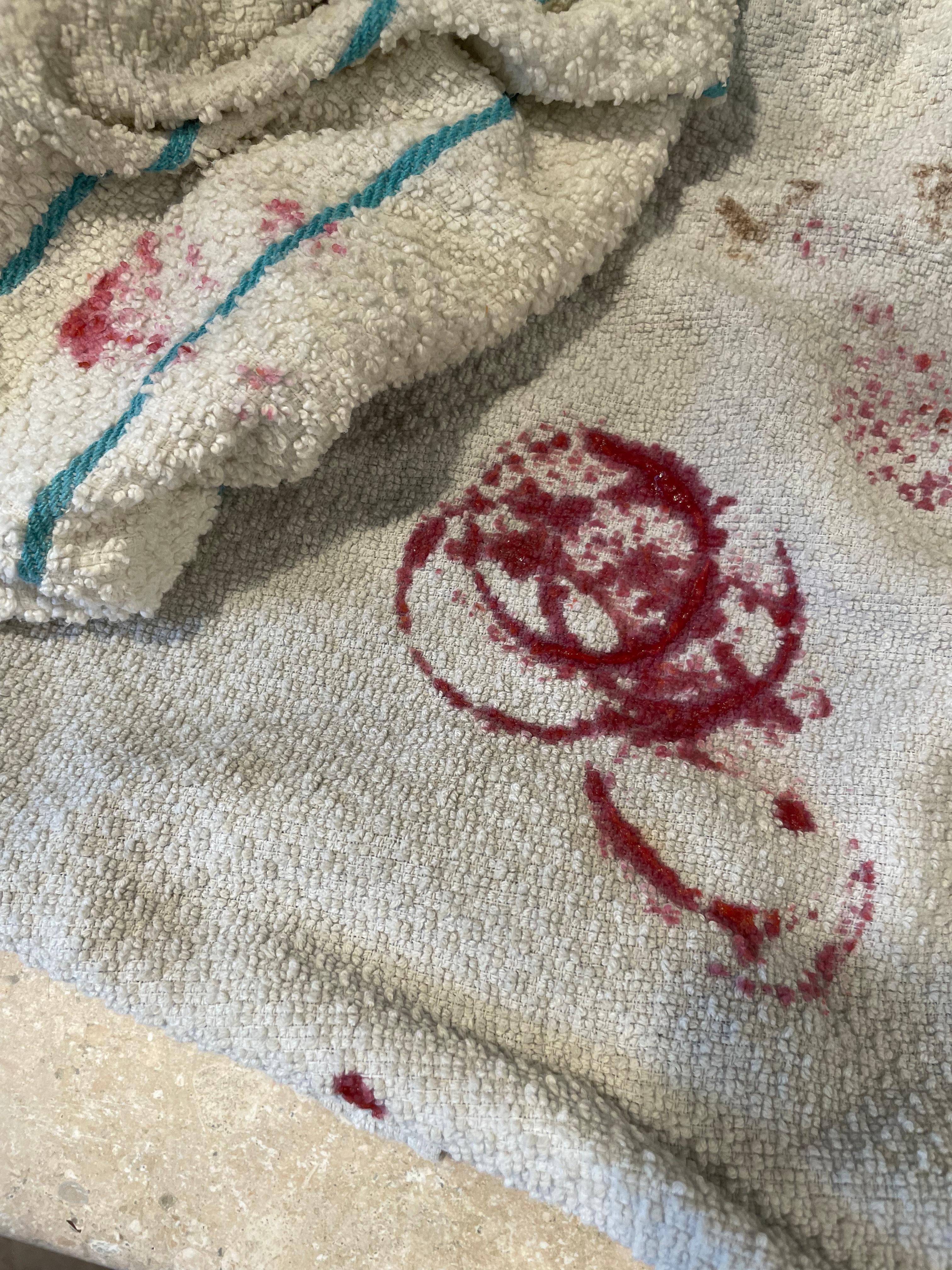 I looked at the towels I’d so carefully arranged on the counter. Plum-colored rings stained them from where I’d set down the funnel. That funnel sure is messy, I think. Those towels are done. Oh, dang it!