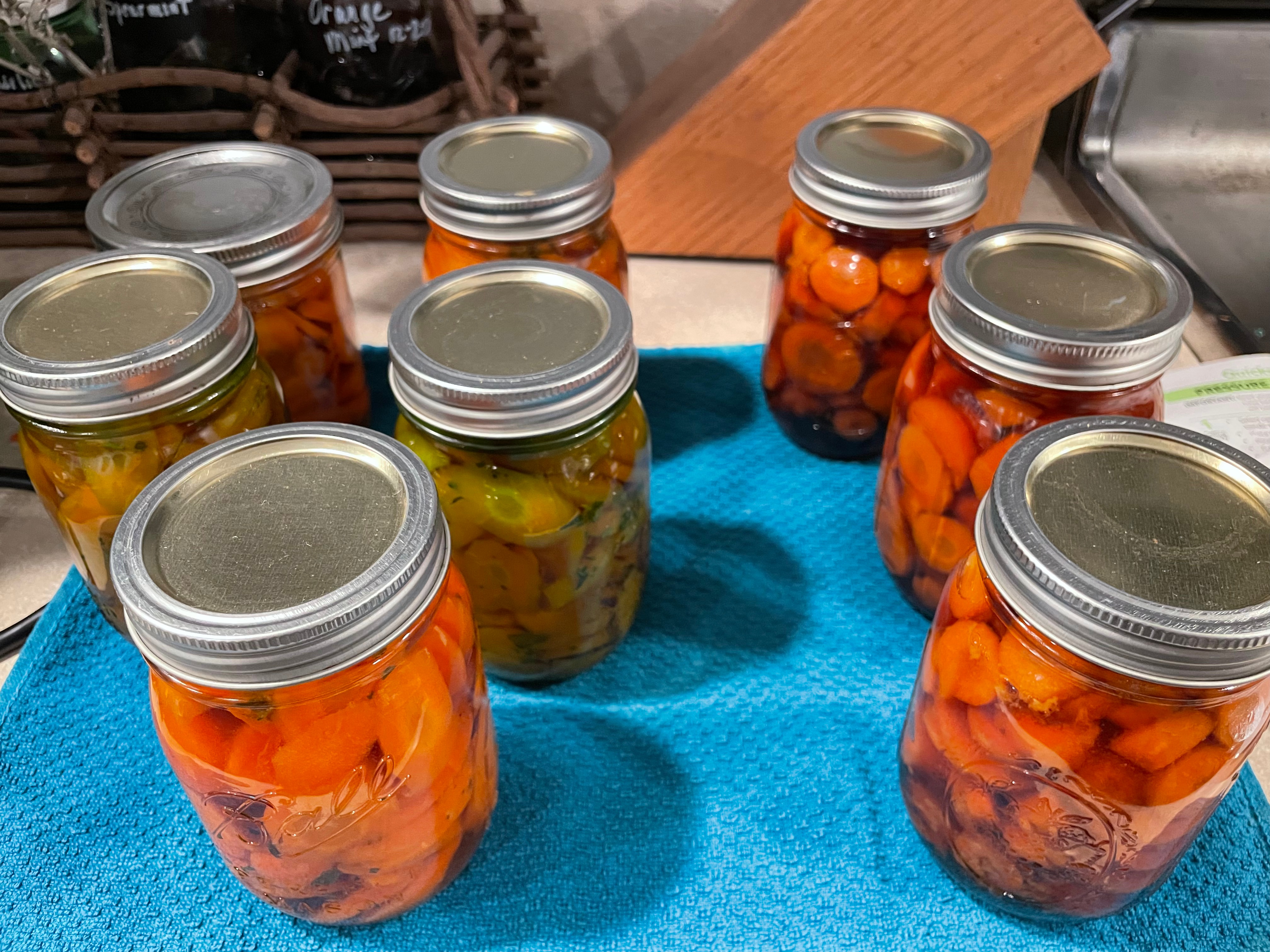I made an ingredient list and headed to the grocery to find that carrots were on sale. Perfect! My test idea was meant to be! And both recipes turned out beautifully! Even though I forgot to run the red stick through the jar to eliminate air bubbles. Was that brain fog or just part of the process? And I blew a breaker— but that wasn’t my fault. Silly builder who used the same breaker for all the kitchen outlets!