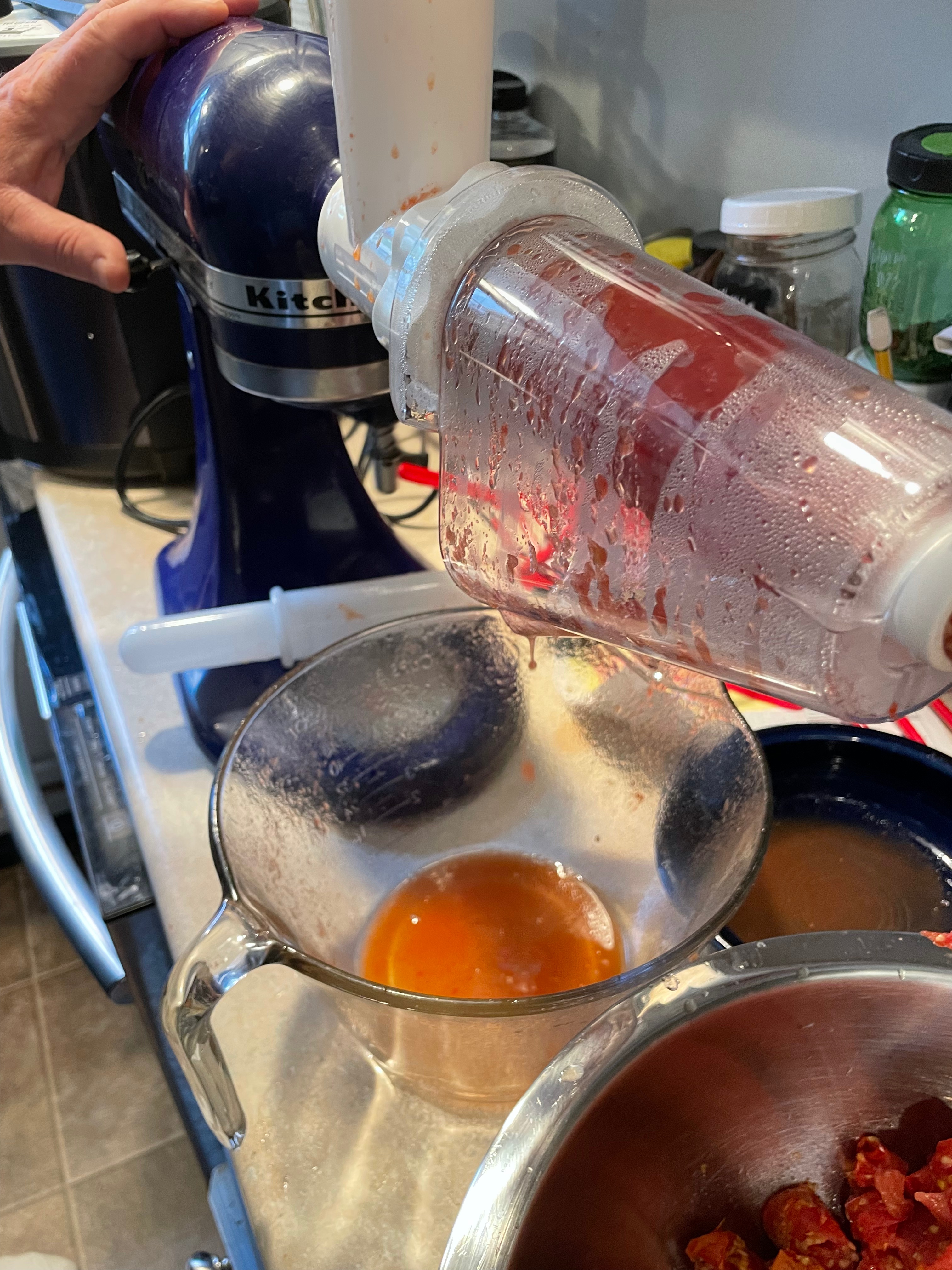 We set up shop. Jerry figured out how the parts should attach, and we put the tomatoes on to boil them for a few minutes. I positioned several bowls under the machine to catch the juice, discarded peel and seeds, and the residual juice when we dumped the primary bowl. It was a regular production line!