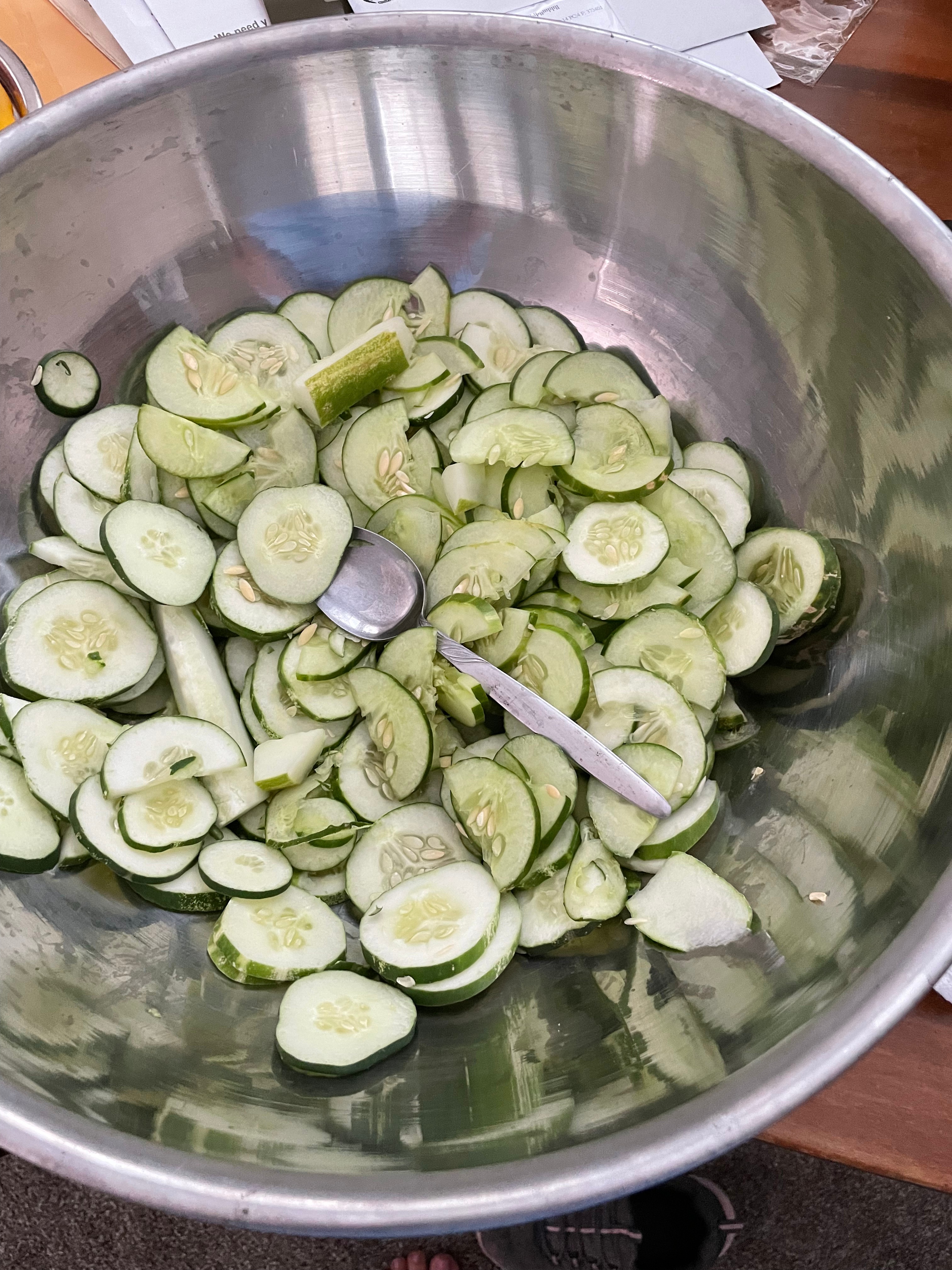 My husband pulled another unused appliance out of the cabinet: this beast could slice the cukes evenly– if they fit into the chute. We girls got the slicing factory going. Soon we had a huge stainless steel bowl filled with pickle wannabes. In the meantime, my husband began slashing the larger cukes into spears.