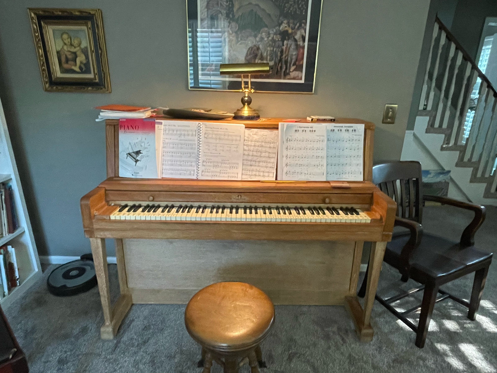 After cleaning out the pantry closet, I sat in the living room resting and congratulating myself. My eyes settled on our ’60s-era blond Wurlitzer school piano that had sat unplayed for years since the last kid moved out. I had an inspiration: what if I took lessons, so I could play Christmas carols this year? I was retired with plenty of time! Why not?