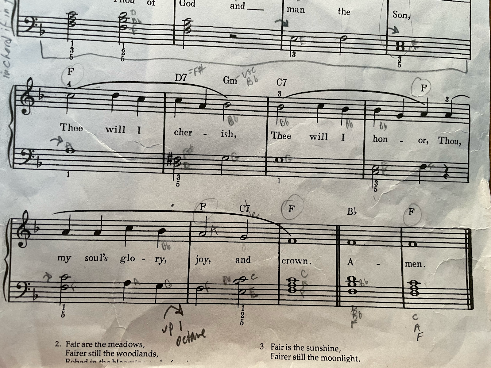 By now, it was time for me to choose a song to play, even though I wouldn’t be in the spring recital. I picked “Fairest Lord Jesus,” from the teacher’s songbooks. I remembered it fondly from my childhood. Surely, it couldn’t be that hard. My teacher made me a copy to take home.