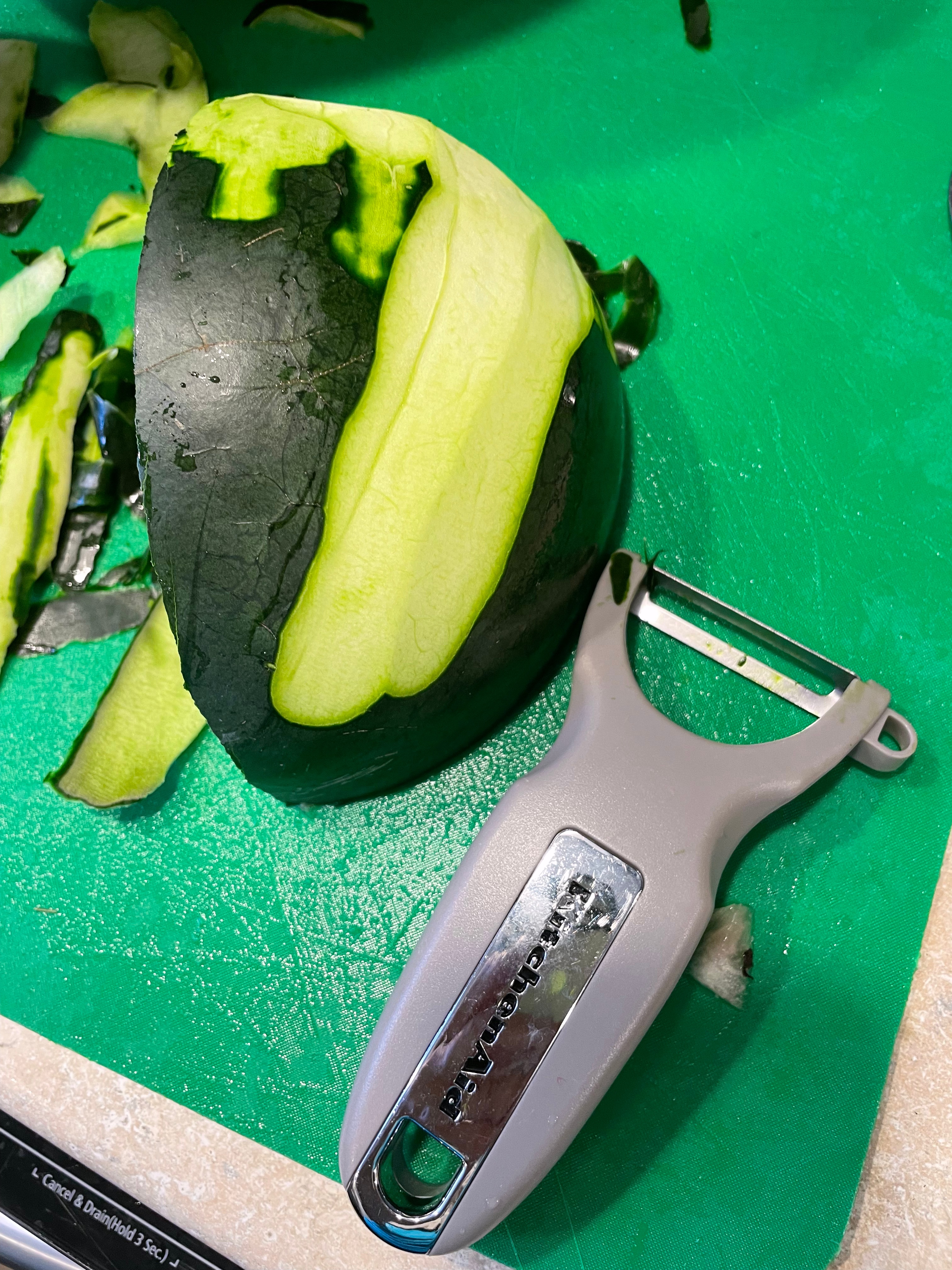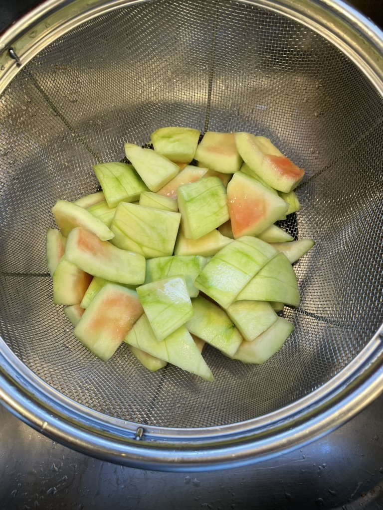 I retrieved the brining watermelon rind from the garage fridge after a grocery run earlier that morning. Accurate, if not full, disclosure: the covered bowl, properly weighted with a plate and another bowl, had been in the garage fridge for an extra day due to an on-the-job injury. Nothing major: to remove the thick skin of the baby watermelon, I was using my slingshot-shaped veggie peeler in the only effective way– toward me– and I peeled my thumb and nail in my exuberance. The visual of the green rind covered in my thickening red blood required a day of recovery. There went a few new red blood cells that my anemic self could have used!