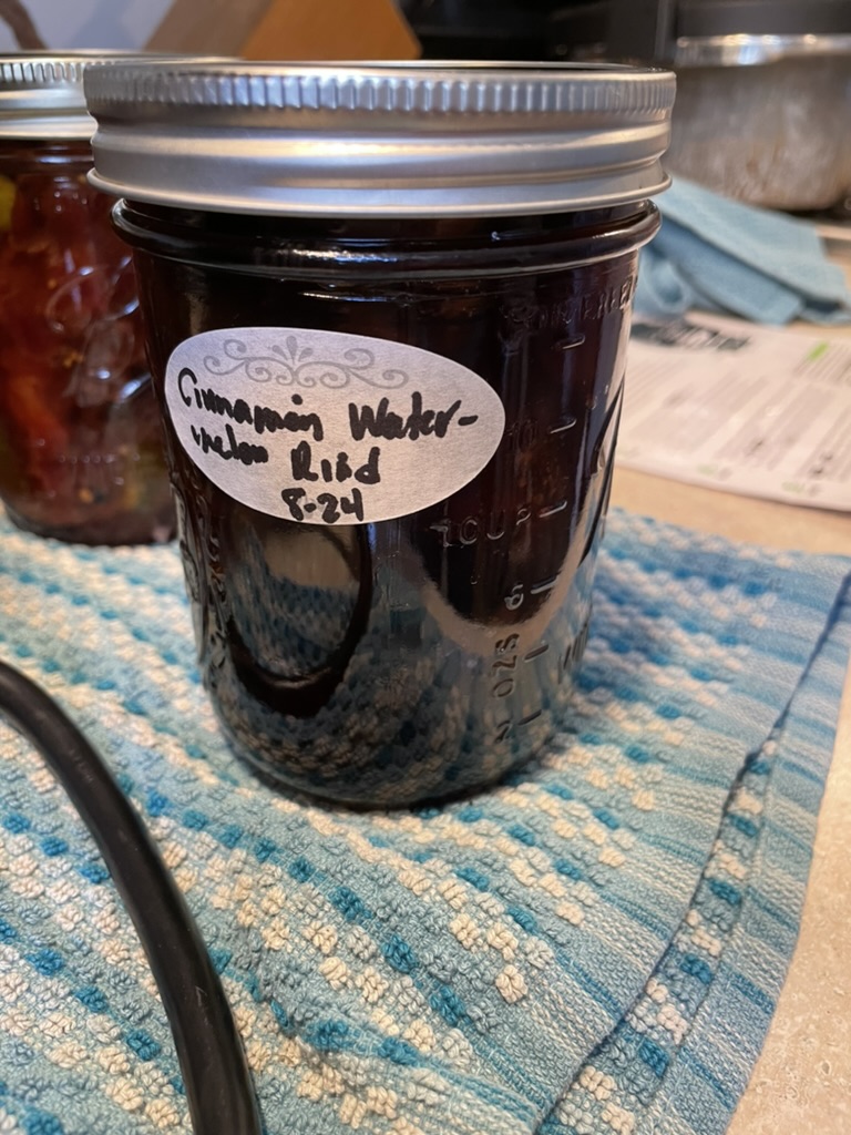 By now, the lovely translucent watermelon rinds had become dark as blackstrap molasses. The syrup was, too. The whole batch had reduced by more than half. Optimistically, I set two wide-mouth pint jars in the canner to heat.
