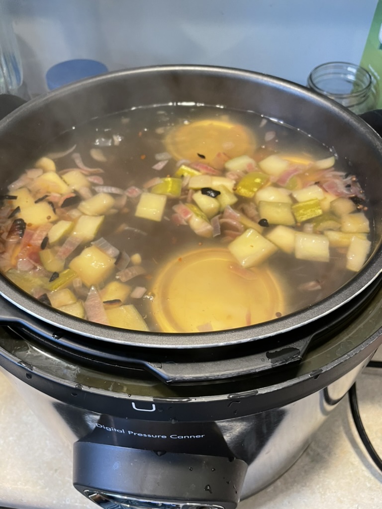 It was time to set up the digital canner and put the jars, bands, and lids into the water to be sterilized. It took twenty minutes, so I estimated that the timing for the jars and relish would be close. But I knew I could do it!