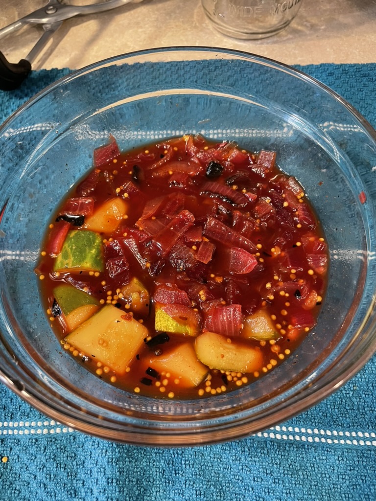 The learning curve for canning has been steep for me. Juggling the tasks isn’t as easy as the recipes seem! Today, I made cinnamon-watermelon rind pickles and charred red onion-cucumber relish. Concurrently.