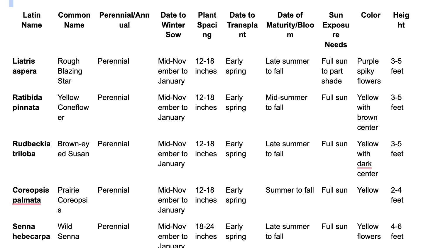 Make a spreadsheet for Zone 6a that includes the following elements for 2025: Latin name, common name, perennial or annual, date to winter sow, plant spacing, date to transplant, date of maturity or bloom, sun exposure needs, color, and height for the following seeds: Liatris aspera, Ratibida pinnata, rudbeckia triloba, coreopsis palmata, Senna hebecarpa, and Auinia Saxatilis.