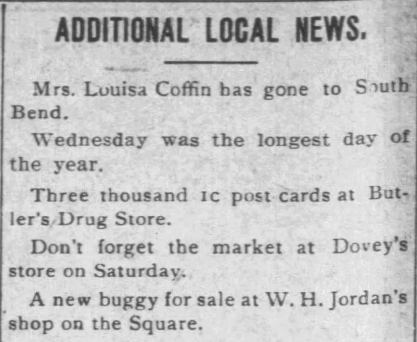 All kinds of information was found in the Banner. Down a few column inches is a short report about the dry spell up at Shirley, Indiana. It seems the last good rain had occurred on April 8 of that year, and the resulting drought was impacting the local potato crop.