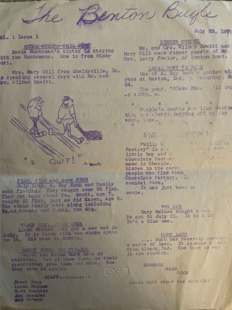 I was 11 years old in late July of 1971 and bored with summer bicycling and fort-making, running under the sprinkler, and playing in the old hay mow. My mom, entrenched in her undergraduate elementary education classwork, came up with a project for us: The Benton Bugle!