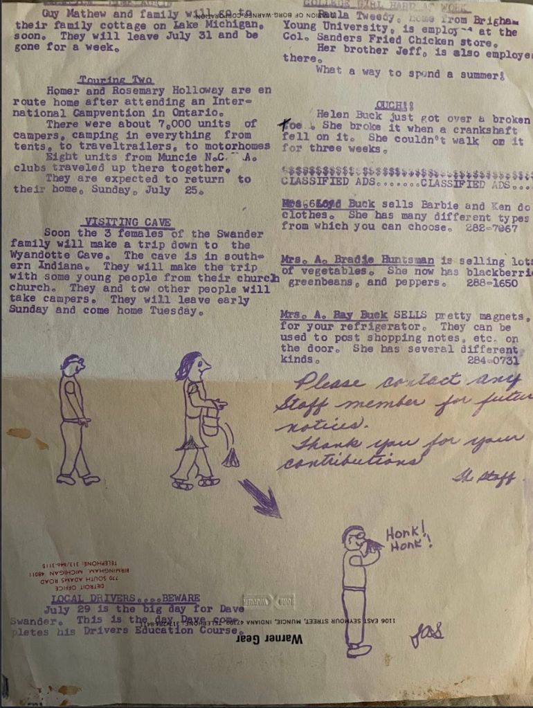 In the early 1970s, my mom was a non-traditional elementary education major at Ball State’s Teachers College. I wonder if she remembered the appeal of the small-town newspaper when she wrangled most of the kids along our country road to try out her new gelatin-based, personal, single-page ditto copier.